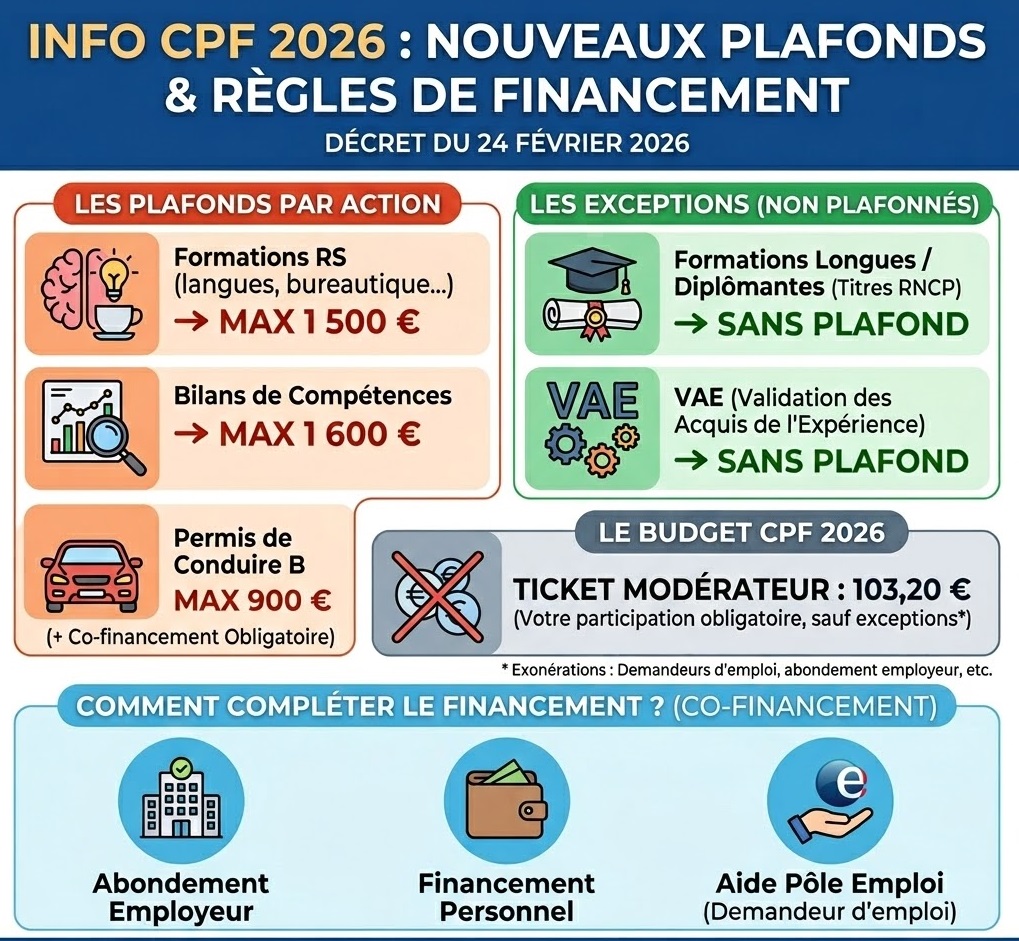 Ainsi, à partir de l’entrée en vigueur de ce Décret, soit à compter du 26 février 2026, les formations enregistrées au répertoire spécifique (formations linguistiques, bureautiques, CACES…) ne permettent de mobiliser qu’un plafond de 1.500,00 Euros par action.